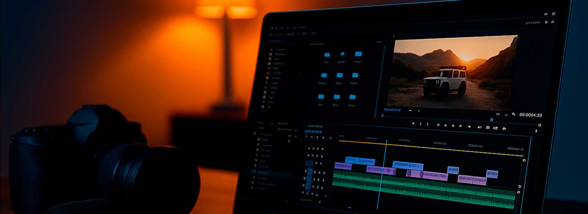 Працюємо з матеріалами замовника або знімаємо/добираємо стокові кадри, робимо монтаж, додаємо графіку, титри, субтитри та озвучення. За потреби готуємо багатомовні версії.